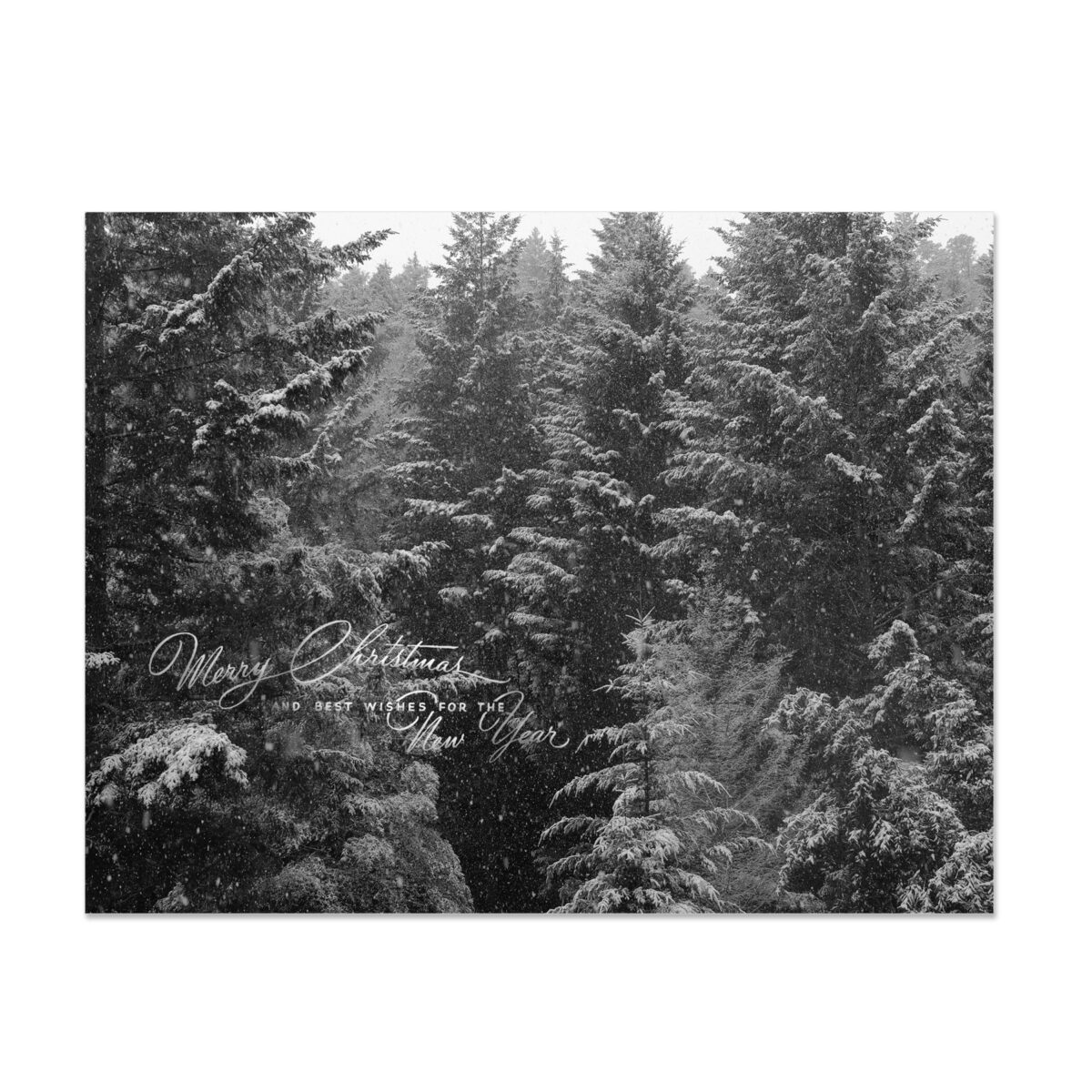 100% post-consumer white card stock with debossed image of alpine forest. Comes with matching white envelope. Add a note if you prefer holiday red envelope!