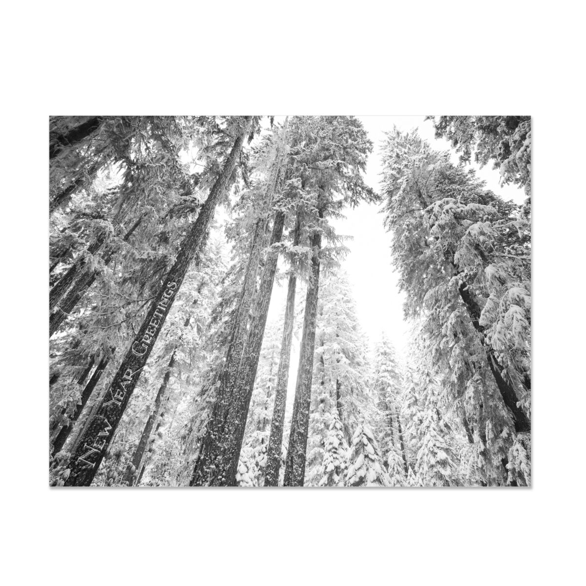 100% post-consumer white card stock with debossed image of alpine forest. Comes with matching white envelope. Add a note if you prefer holiday red envelope!