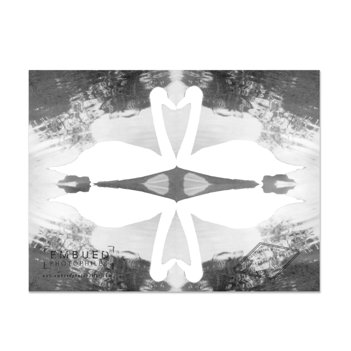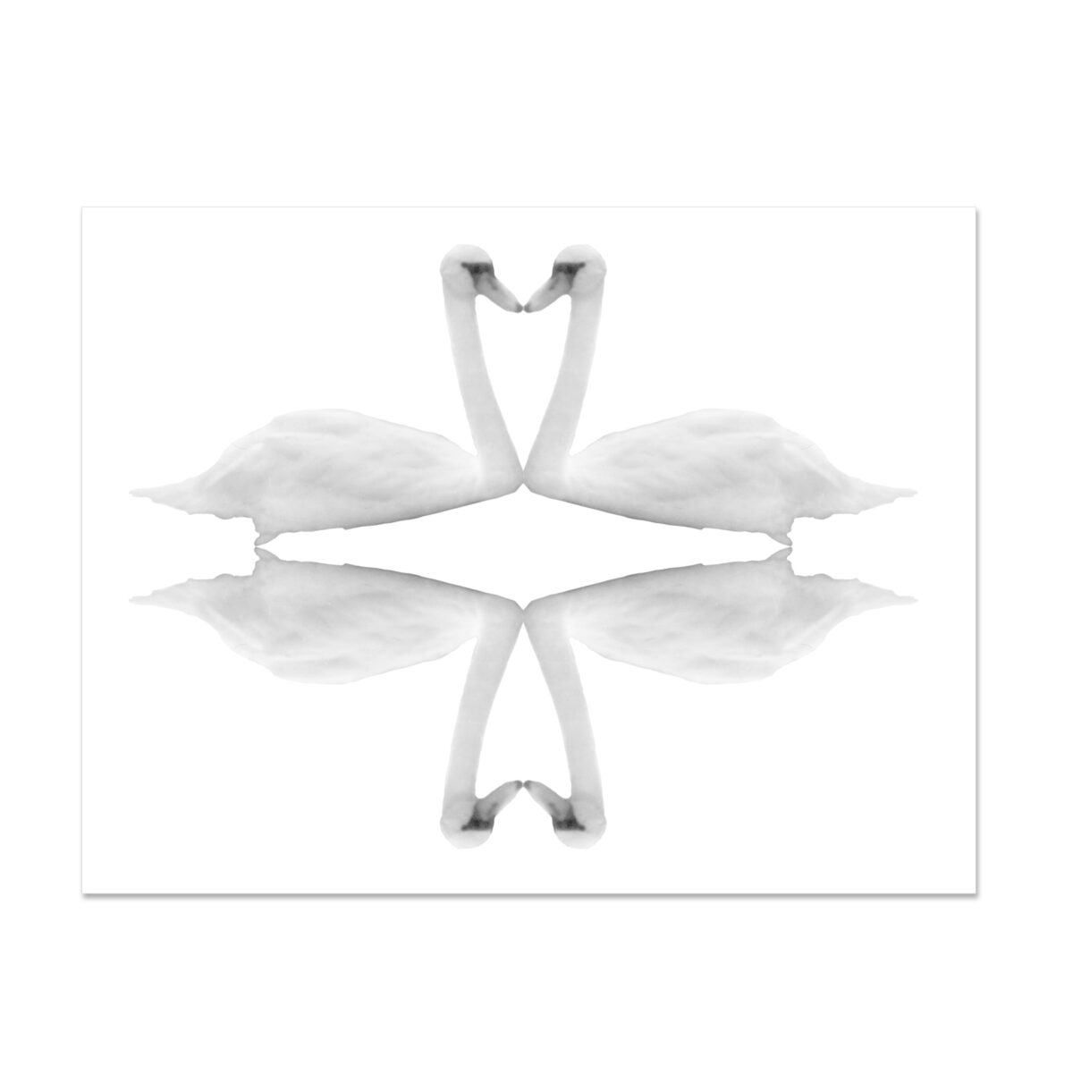 Set of ten unique folded notecards featuring a repeating swan pattern that forms a heart – and a corresponding cut out on transparent back.